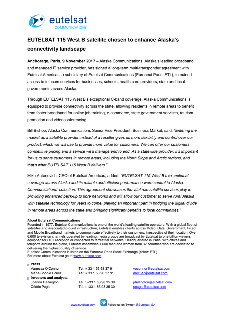 Alaska Communications, Alaska’s leading broadband and managed IT service provider, has signed a long-term multi-transponder agreement with Eutelsat Americas, a subsidiary of Eutelsat Communications (Euronext Paris: ETL), to extend access to telecom services for businesses, schools, health care providers, state and local governments across Alaska.