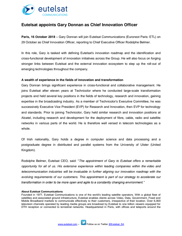 Gary Donnan will join Eutelsat Communications (Euronext Paris: ETL) on 29 October as Chief Innovation Officer, reporting to Chief Executive Officer Rodolphe Belmer.