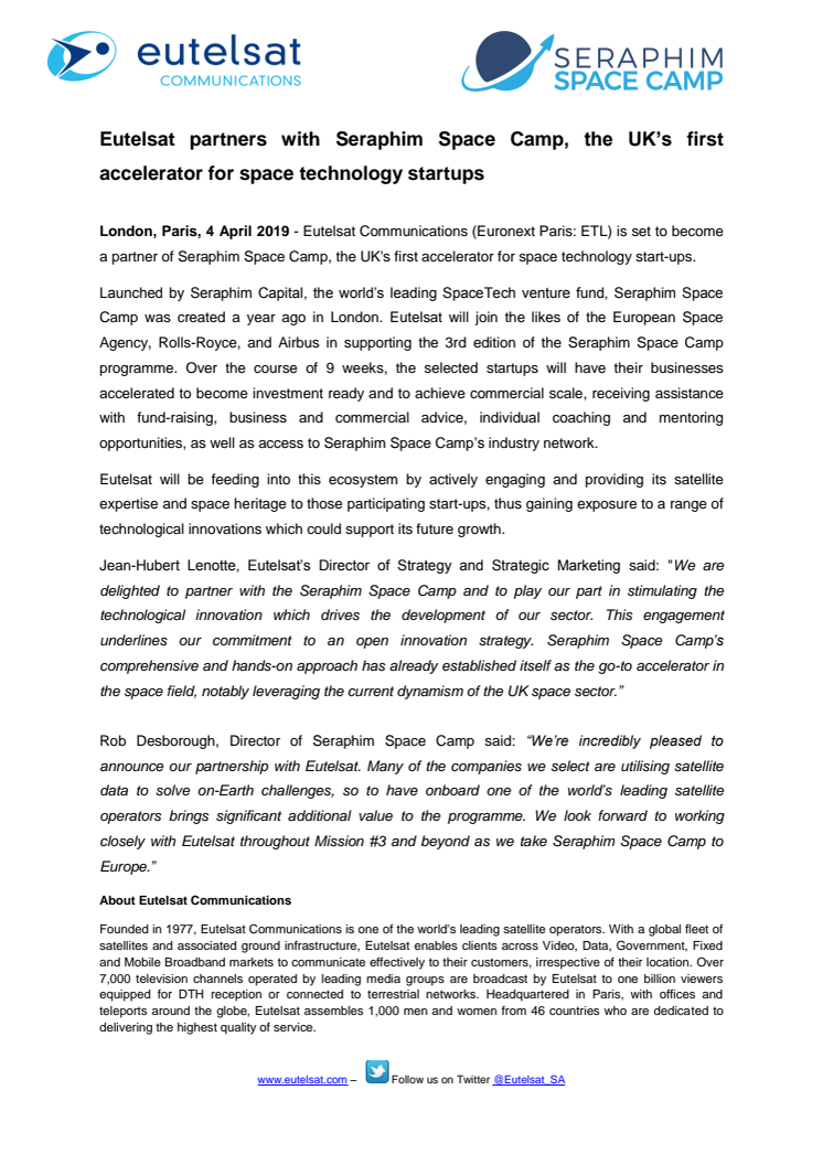 Eutelsat Communications (Euronext Paris: ETL) is set to become a partner of Seraphim Space Camp, the UK's first accelerator for space technology start-ups.