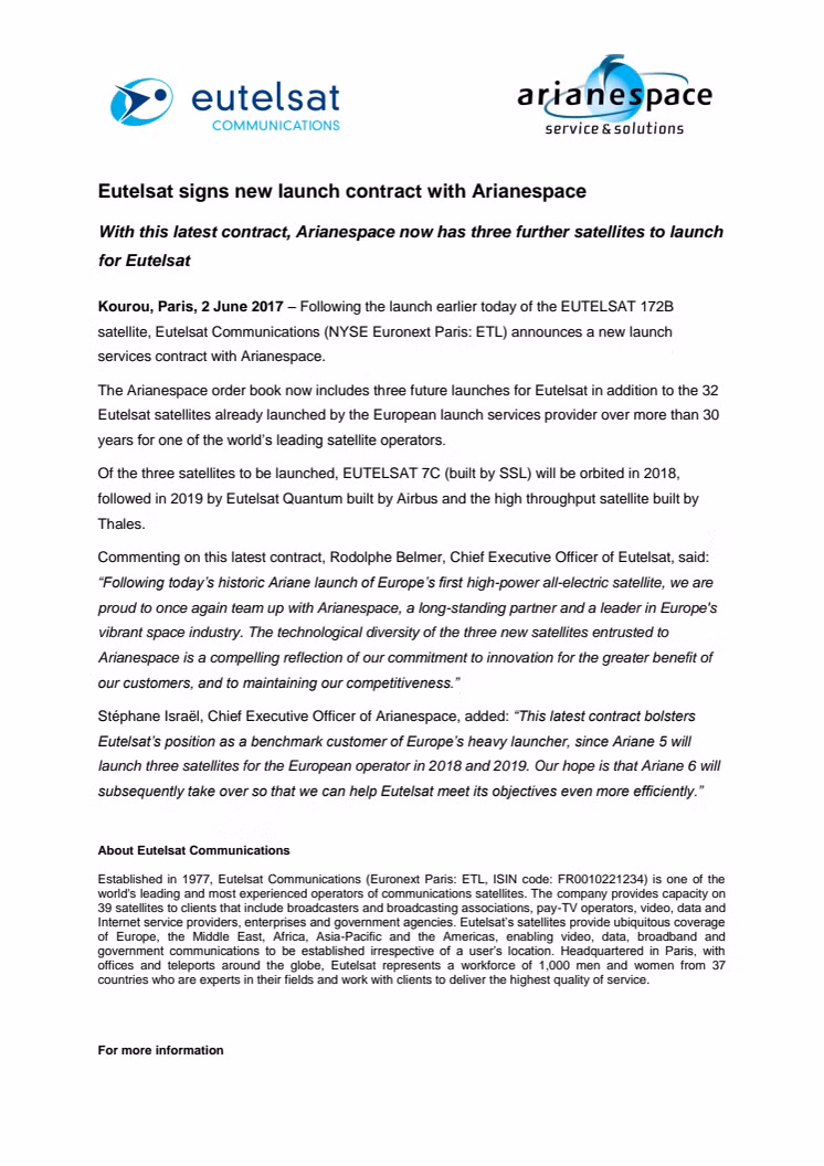Following the launch earlier today of the EUTELSAT 172B satellite, Eutelsat Communications (NYSE Euronext Paris: ETL) announces a new launch services contract with Arianespace.