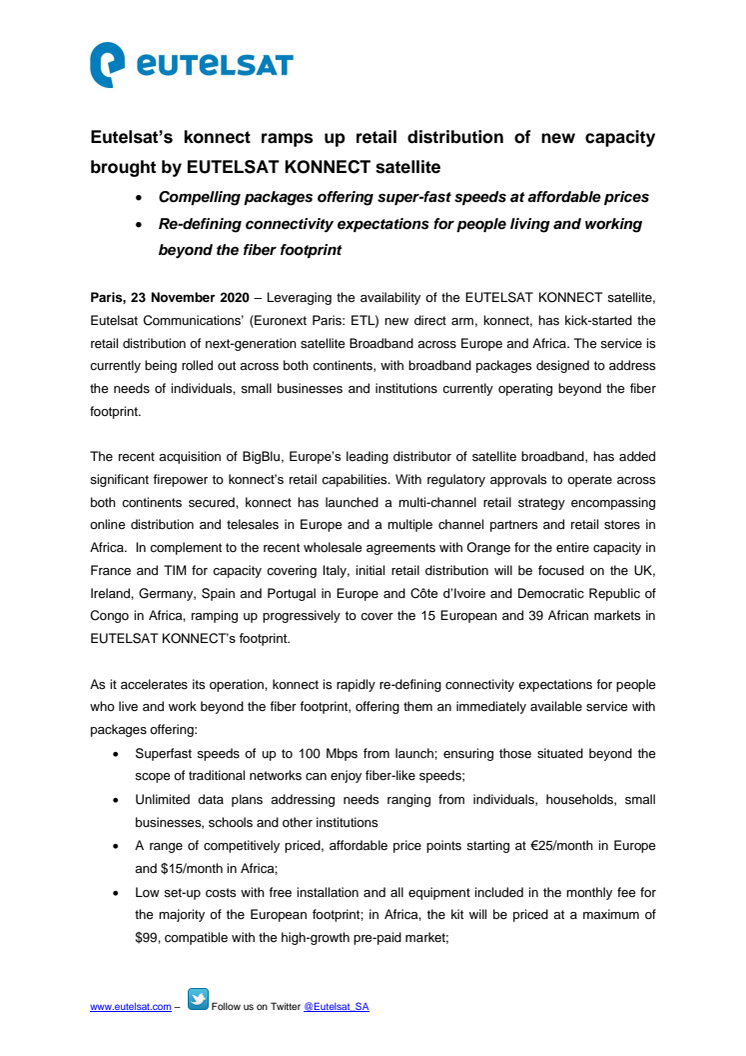 Eutelsat’s konnect ramps up retail distribution of new capacity brought by EUTELSAT KONNECT satellite