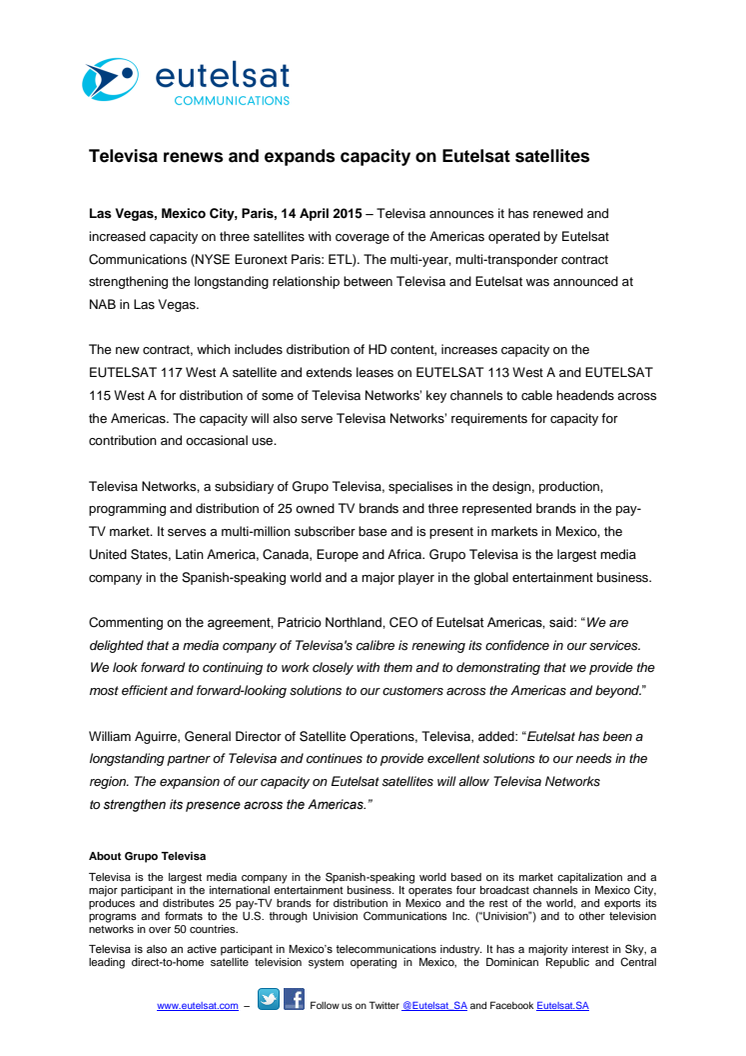 Televisa announces it has renewed and increased capacity on three satellites with coverage of the Americas operated by Eutelsat Communications (NYSE Euronext Paris: ETL). The multi-year, multi-transponder contract strengthening the longstanding relationship between Televisa and Eutelsat was announced at NAB in Las Vegas.