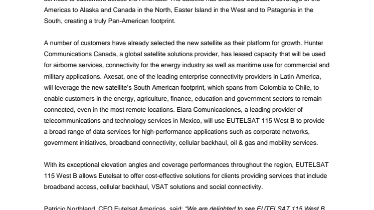 A number of customers have already selected the new satellite as their platform for growth. Hunter Communications Canada, a global satellite solutions provider, has leased capacity that will be used for airborne services, connectivity for the energy industry as well as maritime use for commercial and military applications. Axesat, one of the leading enterprise connectivity providers in Latin America, will leverage the new satellite’s South American footprint, which spans from Colombia to Chile, to enable customers in the energy, agriculture, finance, education and government sectors to remain connected, even in the most remote locations. Elara Comunicaciones, a leading provider of telecommunications and technology services in Mexico, will use EUTELSAT 115 West B to provide a broad range of data services for high-performance applications such as corporate networks, government initiatives, broadband connectivity, cellular backhaul, oil & gas and mobility services.