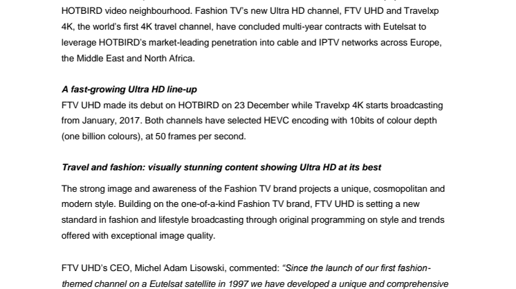 Las Vegas, Paris, 4 January 2016 – One day ahead of the Las Vegas Consumer Electronics Show where Ultra HD is set to be a continuing hot trend, Eutelsat Communications (NYSE Euronext Paris: ETL) announces the launch of two new Ultra HD channels at its popular HOTBIRD video neighbourhood. Fashion TV’s new Ultra HD channel, FTV UHD and Travelxp 4K, the world’s first 4K travel channel, have concluded multi-year contracts with Eutelsat to leverage HOTBIRD’s market-leading penetration into cable and IPTV networks across Europe, the Middle East and North Africa.