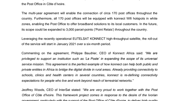 Isaac Gnamba Yao, CEO of La Poste, Côte d’Ivoire added: “In addition to its statutory mission of providing a Universal Postal Service for the transport of mail and other related services, the Post Office in Côte d'Ivoire has now added the task of facilitating access to the Internet for rural populations. To achieve this, it has partnered with konnect and InterSat by signing a memorandum of understanding on 22 December 2020. The agreement, which forms part of a public-private partnership, is one more step by the Post Office in Côte d'Ivoire towards the achievement of its ambition to become the "Maison du Citoyen et des Entreprises, Coursier de l'Etat (House of Citizens and Businesses, State Courier [free translation])".