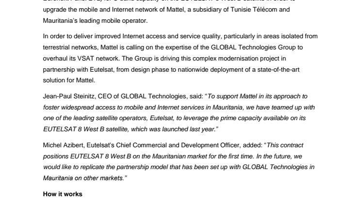 Jean-Paul Steinitz, CEO of GLOBAL Technologies, said: “To support Mattel in its approach to foster widespread access to mobile and Internet services in Mauritania, we have teamed up with one of the leading satellite operators, Eutelsat, to leverage the prime capacity available on its EUTELSAT 8 West B satellite, which was launched last year.”