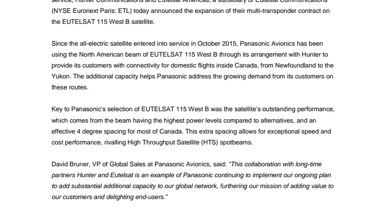 Paris, New York, Lake Forest California, 10 July, 2017 – To provide Panasonic Avionics Corporation with added capacity to address growing customer demand for its in-flight connectivity service, Hunter Communications and Eutelsat Americas, a subsidiary of Eutelsat Communications (NYSE Euronext Paris: ETL) today announced the expansion of their multi-transponder contract on the EUTELSAT 115 West B satellite.