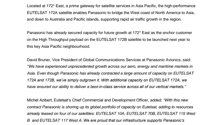 Panasonic has already secured capacity for future growth at 172° East as the anchor customer on the High Throughput payload on the EUTELSAT 172B satellite to be launched next year to this key Asia Pacific neighbourhood.